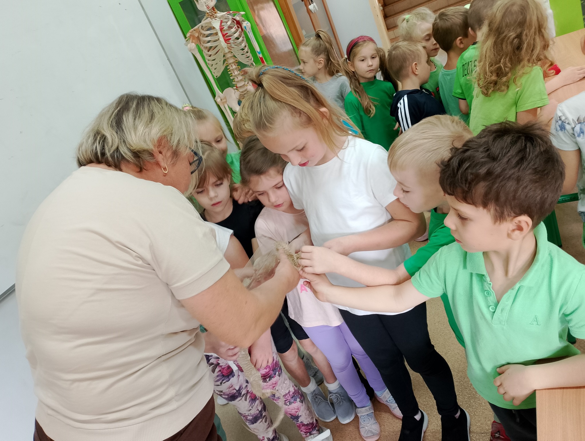Ale to nie wszystko! Po sportowych zmaganiach przedszkolaki zwiedzały szkołę i miały okazję poczuć się jak prawdziwi uczniowie. W sali biologicznej spoglądały przez mikroskop, oglądały model serca i przepływu krwi, a nawet poznały szkielet człowieka. W sali chemicznej zobaczyły ciekawe eksperymenty. W sali informatycznej oglądały zajęcia matematyki przy komputerach. W klasach I i II uczestniczyły w zajęciach plastycznych.